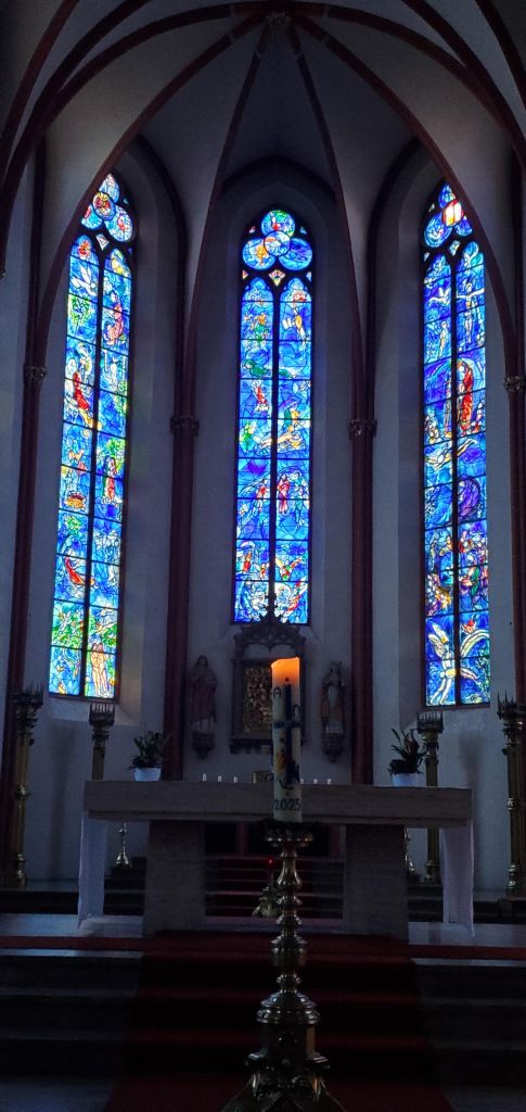 Unfortunately, her colleagues were out of town when we visited. But we stayed one night anyway, mainly to trek to St. Stephen’s Church to glimpse the exquisite stained glass windows created by Marc Chagall, best known as a modernist painter. Those windows were, in a hyphenated word, breath-taking, as soft, blue light filtered into the sanctuary while afternoon gave way to early evening.
