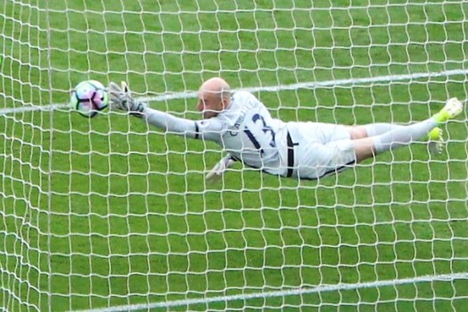 Header goes past the goalkeeper to tie the score in the second half.
