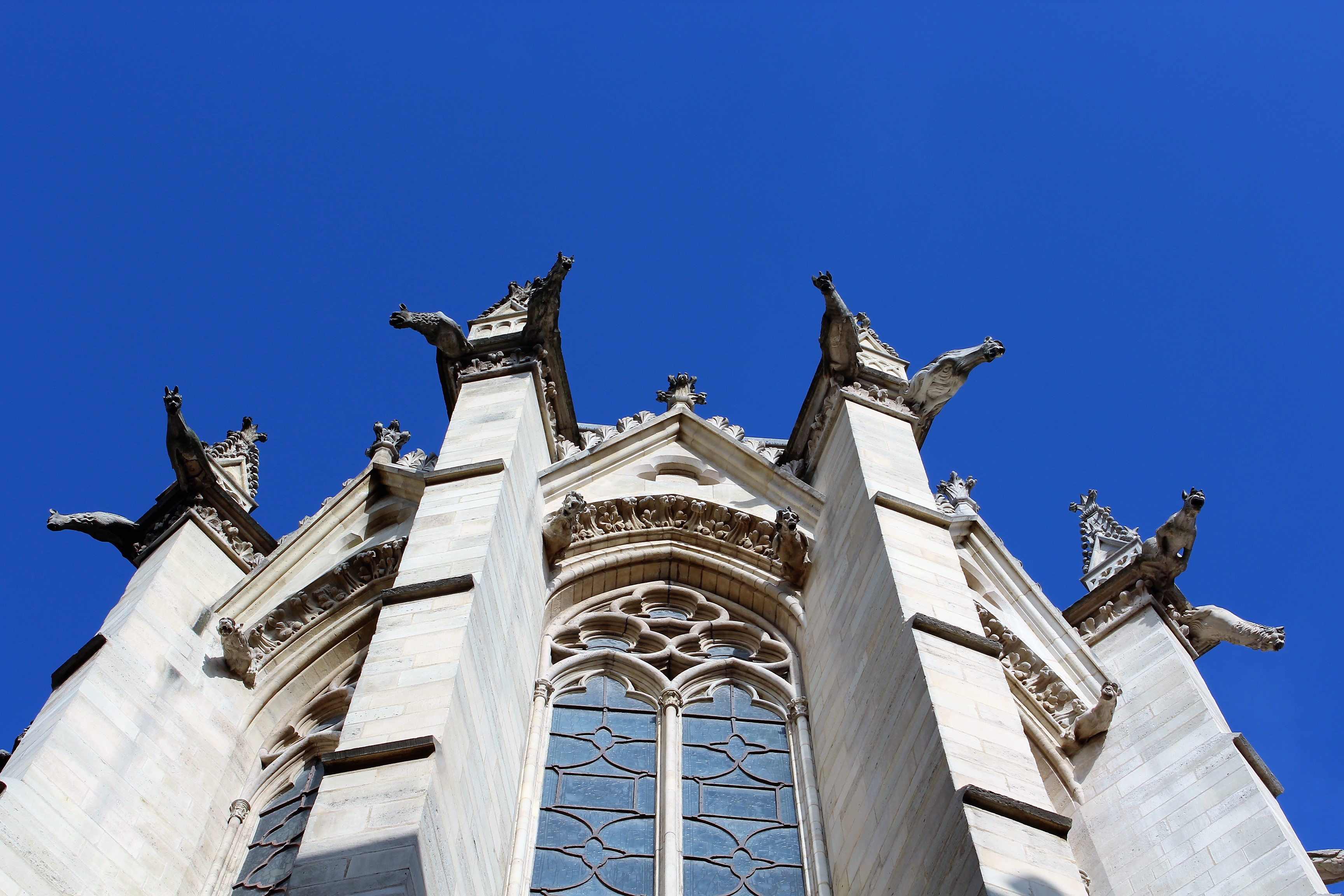 Gargoyles against a clear blue sky at Sainte-Chapelle.