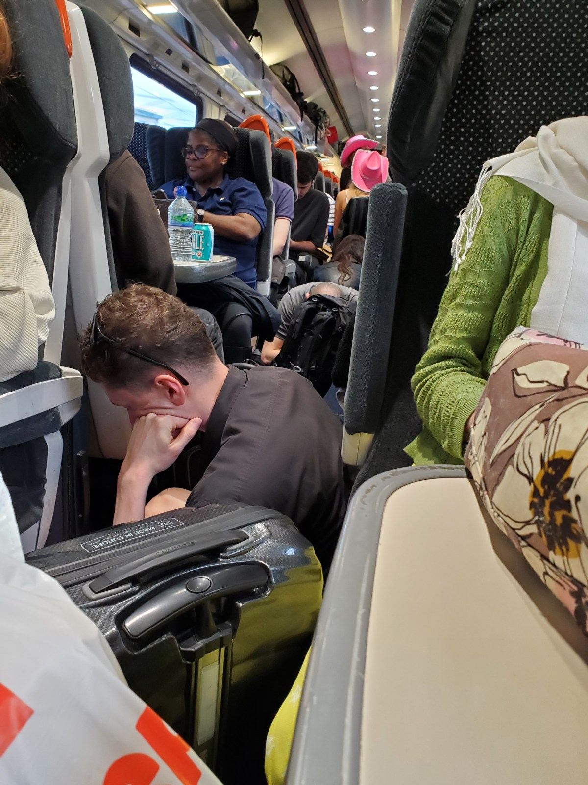 Following another wait, we managed seats on a direct train to London, even snagging unreserved seats in a carriage where 90% of the seats were reserved for some part of the journey. We shared a carriage with far too many others, including a hen party of women in bright pink cowboy hats and some bloke directly behind us who apparently had been in a stage production of “Shawshank Redemption” because he wouldn’t shut the fuck up about it.