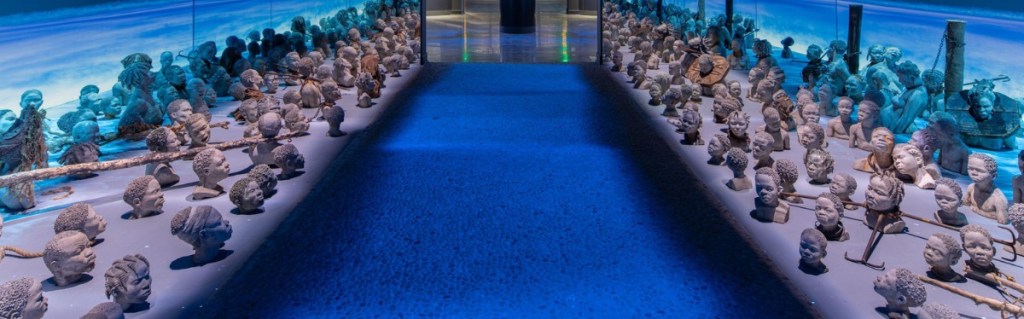 The museum is built to handle crowds. Visitors walk through a long hall designed to resemble a sea floor, with skulls along the sides to depict those whose bodies were tossed overboard during the perilous Atlantic crossing, probably victims of disease or malnourishment. A wide second hall presents the same information in each wall, with a central display. Then the museum opens out, allowing visitors to wander left or right at their leisure.
